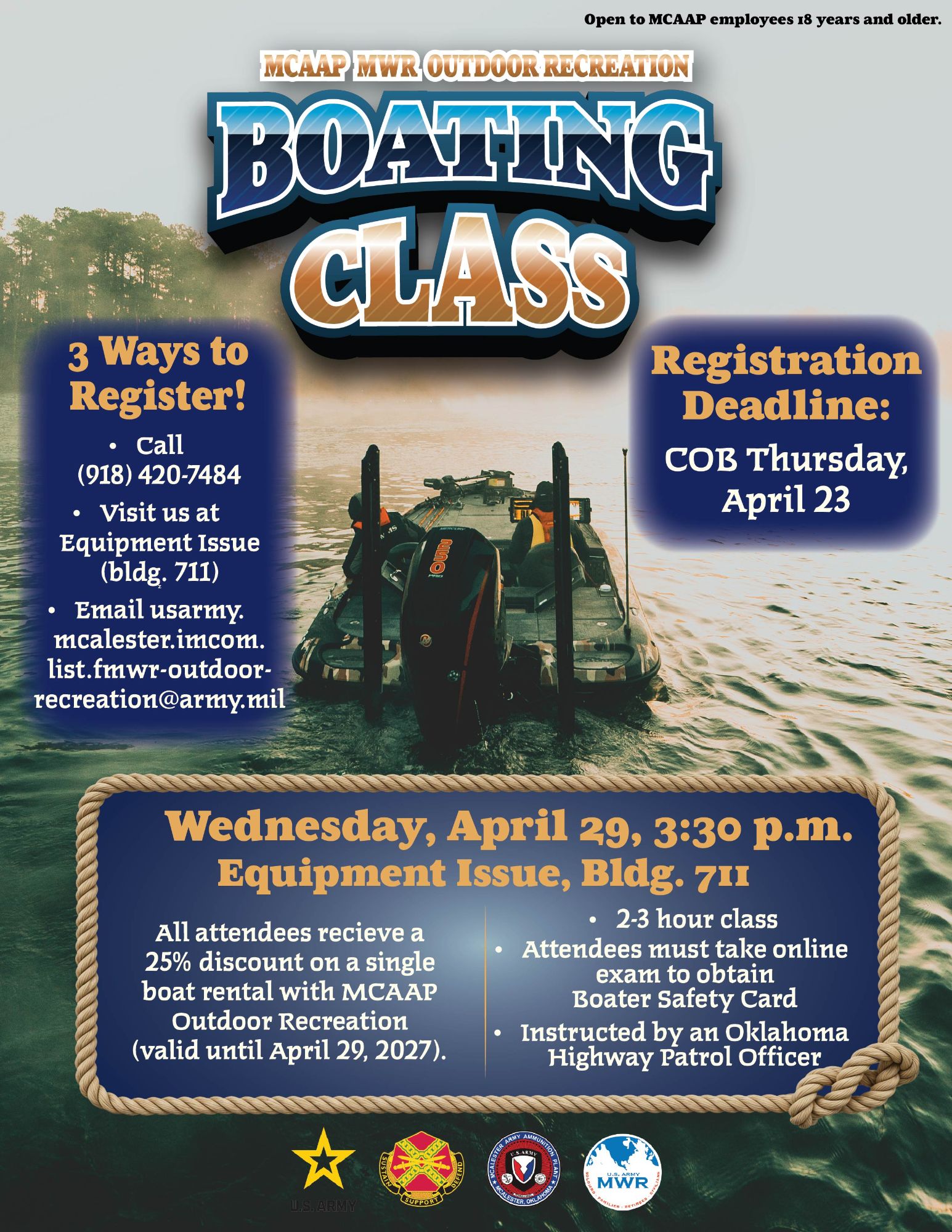 MCAAP MWR Outdoor Recreation is hosting a Boating Class to get you ready for the water! Learn everything you need to know to be safe and confident, taught by an Oklahoma Highway Patrol Officer.